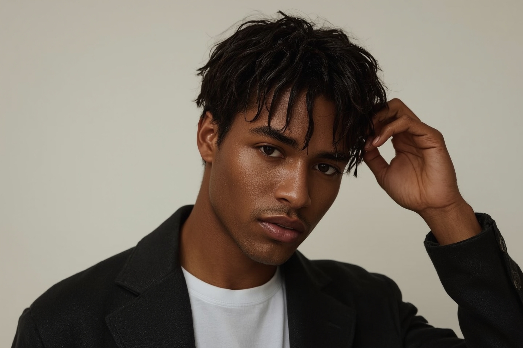 Tu peux aussi jouer avec une frange courte, une raie bien tracée, ou un dégradé flou pour casser la rigidité.